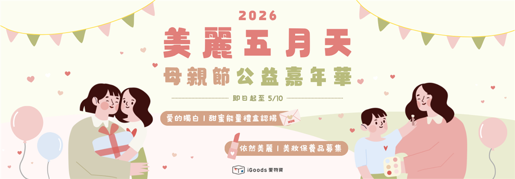 iGoods愛物資與公益單位合作,發起「美麗五月天-母親節公益嘉年華」,募集母親節禮物與美妝保養品,邀請大眾成為愛的推手,幫助孩子送出一份對媽媽與照顧者們的感謝。
