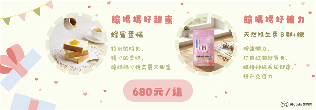 今年母親節禮物,特別準備甜蜜能量禮盒,蜂蜜蛋糕撫慰媽媽的辛勞,孩子可以和媽媽或照顧者一同享用,未開封之前可以不用冷藏,讓公益單位好發放,孩子們也方便帶回去送禮物!同時也加上永騰生技的天然維生素B群(西印度櫻桃維生素C+ 天然酵母B群+ 鐵),讓媽媽和照顧者可以在忙碌中持續補充身體所需的營養,從最根本的地方,照顧好自己。